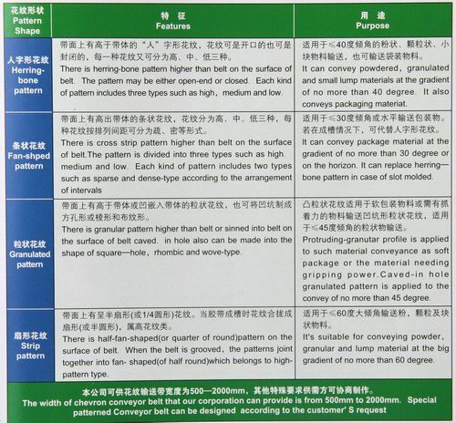 花紋輸送帶是由帶體和花紋部分組成,由于運送的物料和輸送機傾角大小的不同,要求花紋的形狀和高低(深淺)也不同。